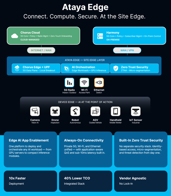 Ataya Edge is a unified platform that resolves this tension. It converges private 5G connectivity, edge AI compute orchestration, and Zero Trust security into a single, cohesive architecture deployed at the site edge. This brief describes the Ataya Edge platform architecture, its deployment models, and the use cases it enables across manufacturing, logistics, healthcare, and other industrial environments.